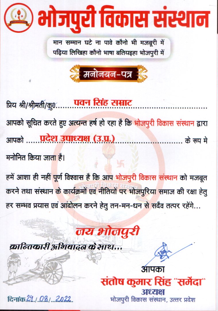 श्री पवन सिंह “सम्राट” को “प्रदेश उपाध्यक्ष ऊ.प्र.” के रूप में मनोनयन किया गया-मुख्यालय भोजपुरी विकास संस्थान श्री पवन सिंह “सम्राट” को “प्रदेश उपाध्यक्ष ऊ.प्र.” के रूप में मनोनयन किया गया-मुख्यालय भोजपुरी…