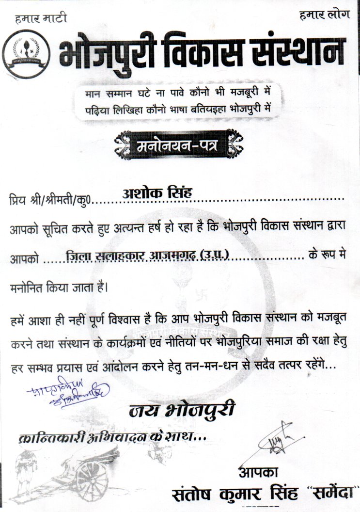 श्री अशोक सिंह को “जिला सलाहकार आजमगढ़ ” के रूप में मनोनयन किया गया-मुख्यालय भोजपुरी विकास संस्थान श्री अशोक सिंह को “जिला सलाहकार आजमगढ़ ” के रूप में मनोनयन किया गया-मुख्यालय…