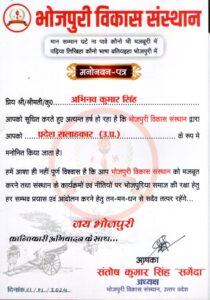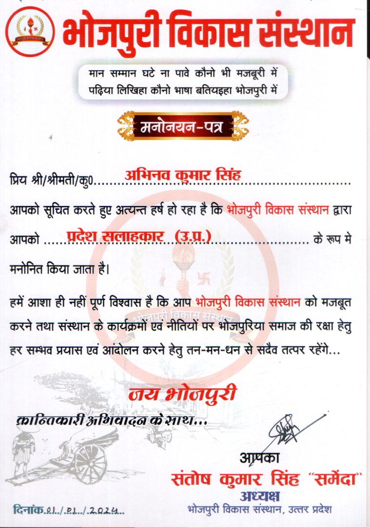 Blog श्री अभिनव कुमार सिंह को “प्रदेश सलाहकार ऊ.प्र”. के रूप में मनोनयन किया गया-मुख्यालय भोजपुरी विकास संस्थान admin श्री अभिनव कुमार सिंह को “प्रदेश सलाहकार ऊ.प्र”. के रूप में मनोनयन किया गया-मुख्यालय भोजपुरी विकास संस्थान