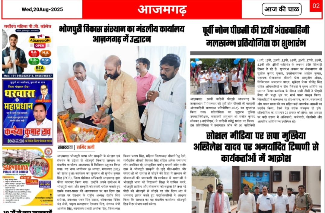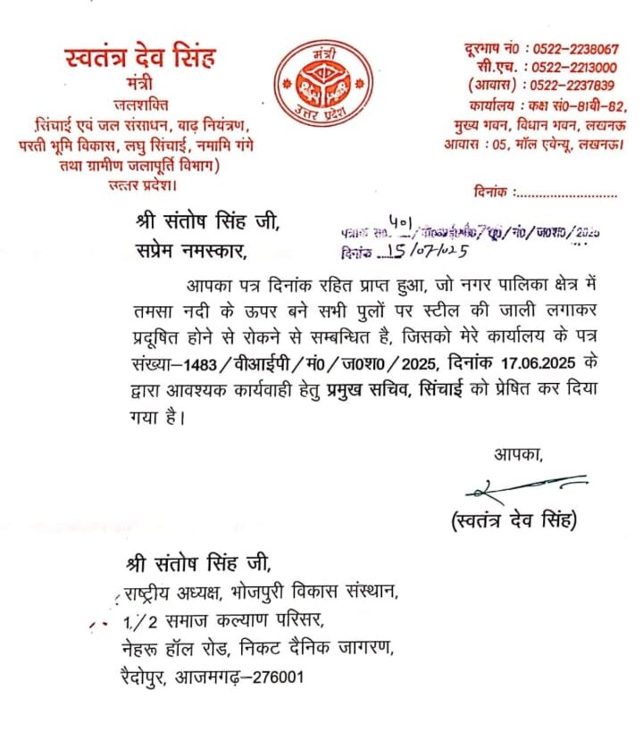 लखनऊ :श्री स्वतंत्रदेव सिंह जल शक्ति मंत्री उत्तर प्रदेश सरकार से आजमगढ़ तमसा नदी के पुलों पर जली लगाने के प्रस्ताव अप्रूवल के लिए भेजा गया ताकि आजमगढ़ के सभी पुलों पर सुरक्षा के दृस्टिगत जाली लगे भोजपुरी विकास संस्थान के प्रस्ताव पर पत्र जारी किया सरकार ने
