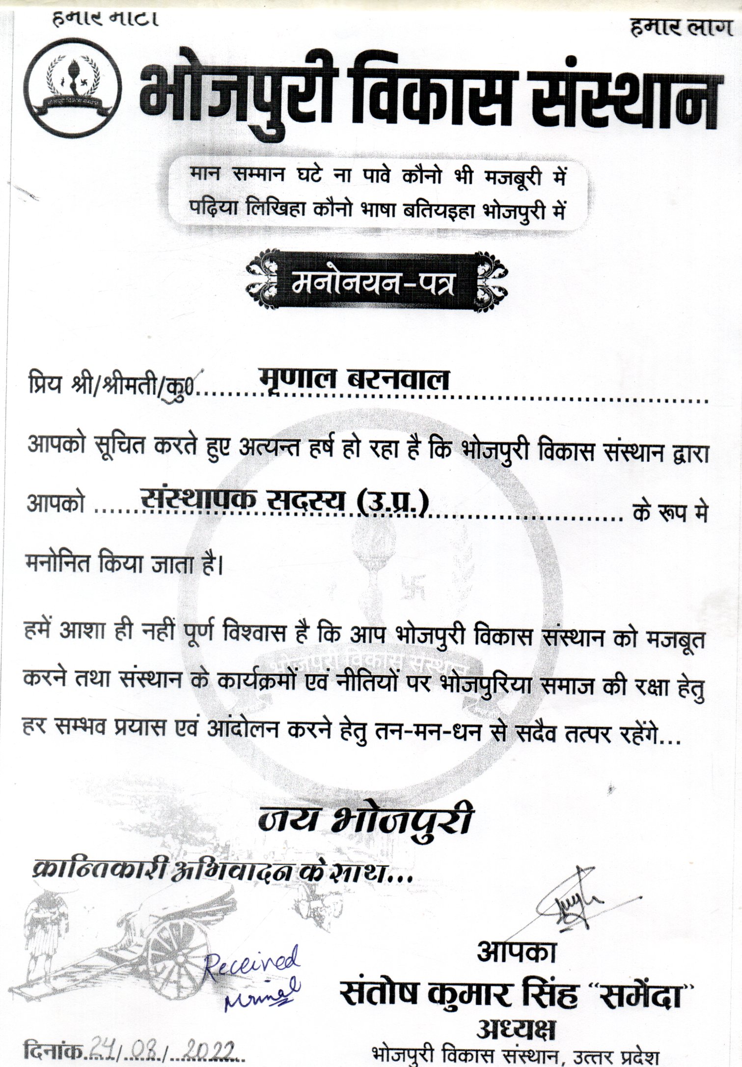 Blog श्री मृणाल बरनवाल को “संस्थापक सदस्य ” के रूप में मनोनयन किया गया-मुख्यालय भोजपुरी विकास संस्थान admin श्री मृणाल बरनवाल को “संस्थापक सदस्य ” के रूप में मनोनयन किया गया-मुख्यालय भोजपुरी विकास संस्थान