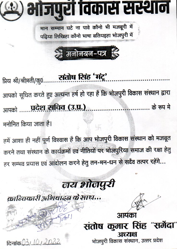 श्री संतोष सिंह मंटू को “प्रदेश सचिव” के रूप में मनोनयन किया गया-मुख्यालय भोजपुरी विकास संस्थान
