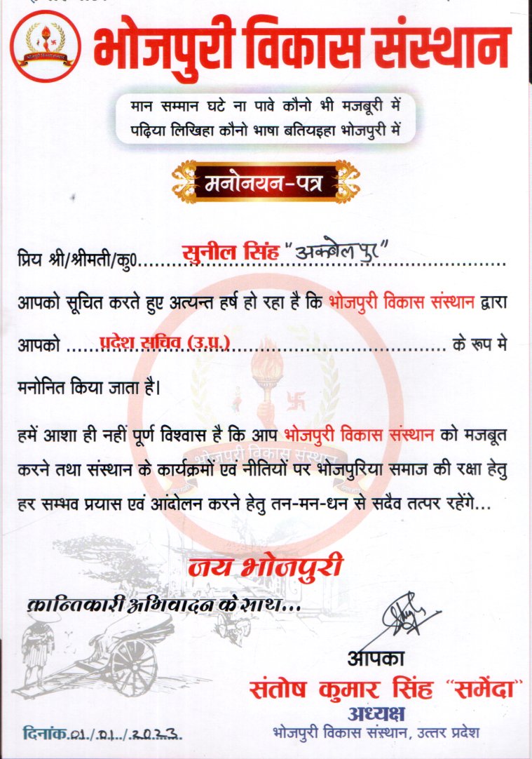 Blog श्री सुनील सिंह “अकबेलपुर” को “प्रदेश सचिव ऊ.प्र.” के रूप में मनोनयन किया गया-मुख्यालय भोजपुरी विकास संस्थान admin श्री संजीव तिवारी को “जिला सलाहकार आजमगढ़”. के रूप में मनोनयन किया गया-मुख्यालय भोजपुरी विकास संस्थान