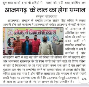 अंतर्राष्ट्रीय भोजपुरी संगम अरविन्द चित्रांश जी द्वारा गौरवशाली पूर्वांचल पत्रिका सप्रेम भेंट किया गया। संग देवनाथ सिंह जी, आलोक सिंह जी,दिनेश चंद सैनी जी, अनिल सिंह काकन जी की भोजपुरी विकास संस्थान मुख्यालय आजमगढ़ पर विशेष उपस्थिति रही। जय भोजपुरी। जय आजमगढ़।