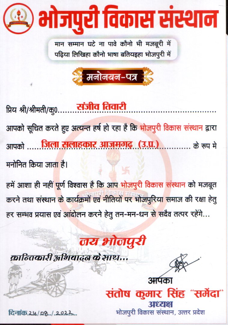 श्री संजीव तिवारी को “जिला सलाहकार आजमगढ़”. के रूप में मनोनयन किया गया-मुख्यालय भोजपुरी विकास संस्थान श्री संजीव तिवारी को “जिला सलाहकार आजमगढ़”. के रूप में मनोनयन किया गया-मुख्यालय भोजपुरी विकास…